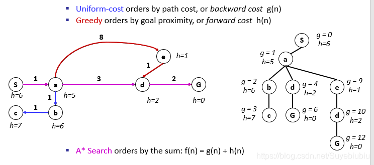 A*搜索不同于贪婪算法,贪婪算法仅仅利用了启发式函数h(x),A*算法结合了代价一致算法UCS和贪婪算法的优点。A*算法可以看到到达此节点已经花费的代价( g(x) ),A*搜索的启发式函数变为了f(n)=g(n)+h(n)。整体来说,A*算法既是完备的也是最优的。