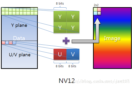 下面给读者展示一副关于YUV-NV12, NV21存储的图片: