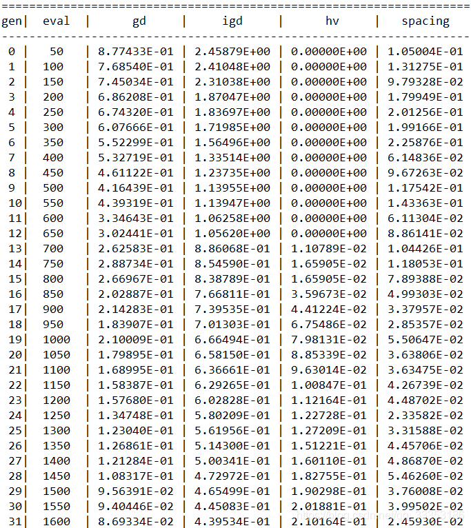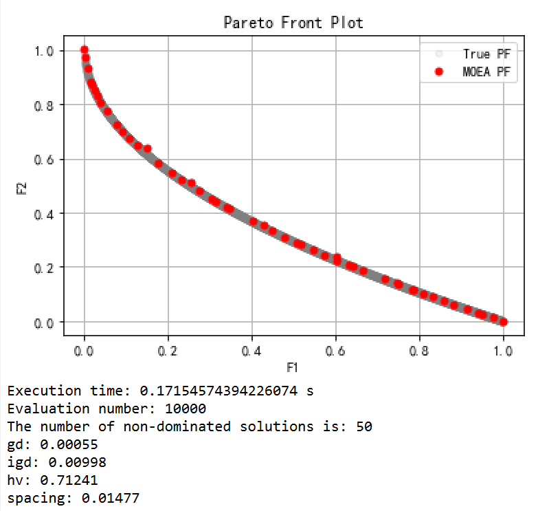 第二步:在同一个文件夹下编写执行脚本,实例化上述问题类的对象,然后调用Geatpy提供的nsga2算法的进化算法模板(moea_NSGA2_templet),最后结合理论全局最优解PF(即俗称的“真实前沿点”)通过计算GD、IGD、HV等指标来分析优化效果: