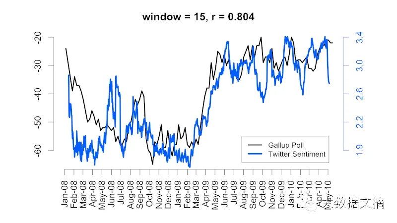 l Twitter sentiment versus Gallup Poll of Consumer Confidence:挖掘Twitter(中文:微博)中的用户情感发现,其与传统的调查、投票等方法结果有高度的一致性(以消费者信心和政治选举为例,corelation达80%),详细见论文:Brendan O'Connor, Ramnath Balasubramanyan, Bryan R. Routledge, and Noah A. Smith. 2010. From Tweets to Polls: Linking Text Sentiment to Public Opinion Time Series. In ICWSM-2010。(注:下图中2008年到2009年初,网民情绪低谷是金融危机导致,从2009年5月份开始慢慢恢复)