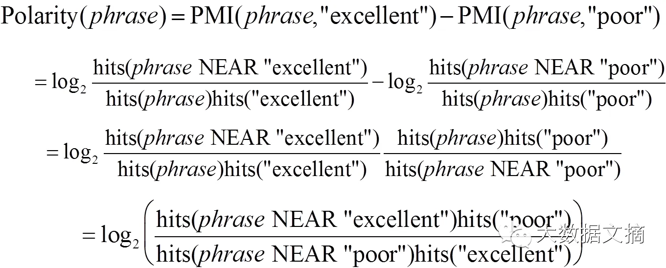 那么,计算一个phrase的polarity公式为(excellent和poor也可以使用其它已知极性词代替):
