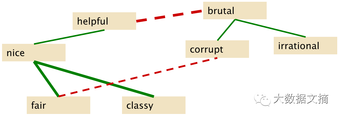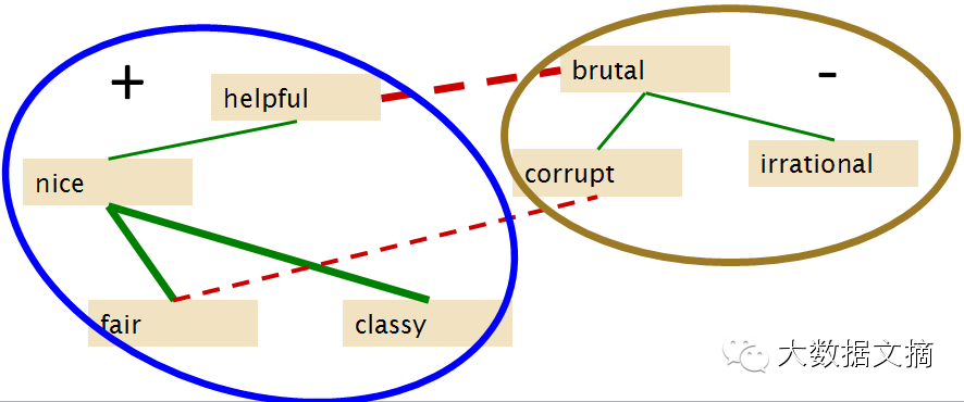 1. Hatzivassiloglou & McKeown:论文见Vasileios Hatzivassiloglou and Kathleen R. McKeown. 1997. Predicting the Semantic Orientation of Adjectives. ACL, 174–181,基于这样的一种语言现象:“Adjectives conjoined by ‘and’’ have same polarity;Adjectives conjoined by ‘but ‘ do not”,如下示例: