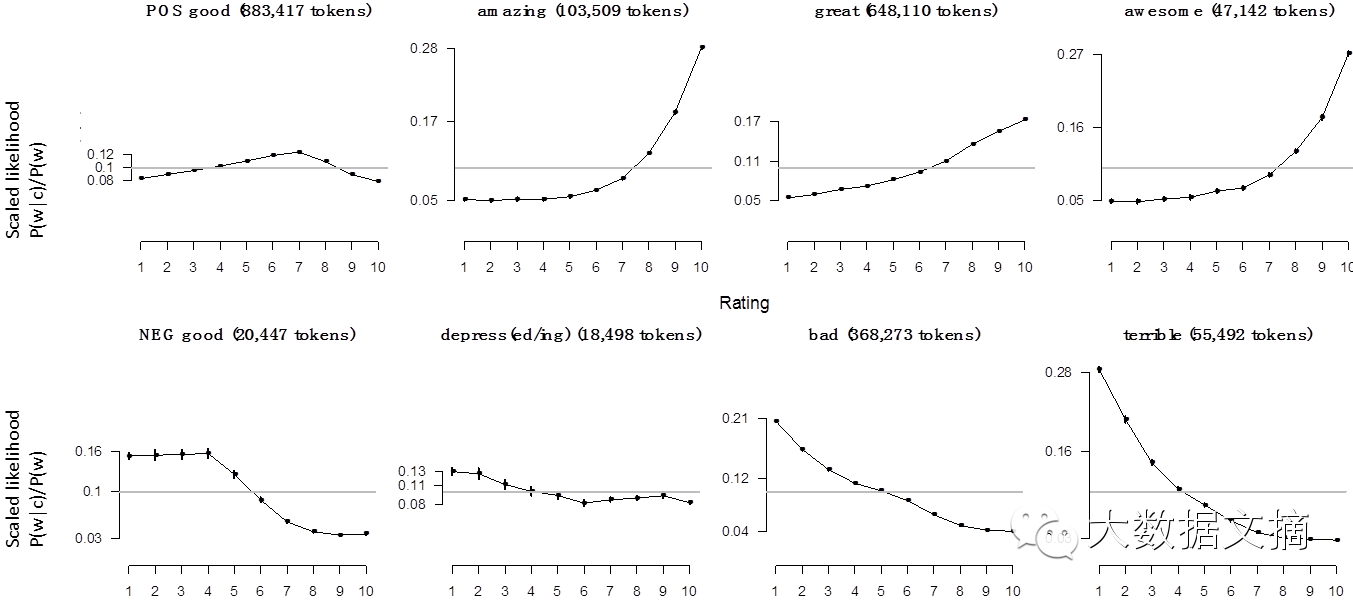 如下图所示,列出了部分词条在不同类别下的Scaled likelihood,据此可以判断每个词条的倾向性。