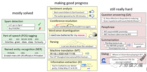 取得长足进展:情感分析、共指消解、词义消歧、句法分析、机器翻译、信息抽取