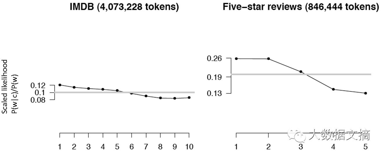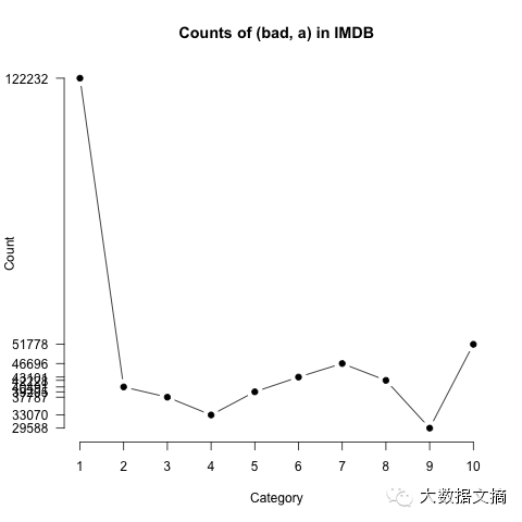 给定一个词,如何确定其以多大概率出现在某种情感类别文本中呢?以IMDB下不同打分下影评为例,最简单的方法就是计算每个分数(星的个数)对应的文本中词条出现的频率,如下图所示为Count(“bad”)分布情况: