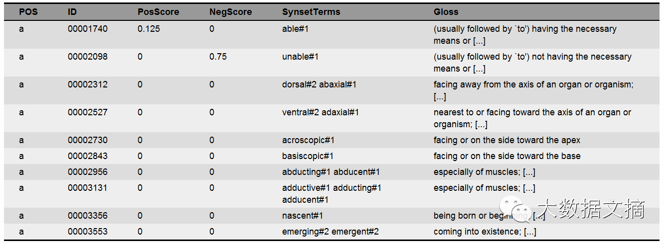 SentiWordNet:其通过对WordNet中的词条进行情感分类,并标注出每个词条属于positive和negative类别的权重大小,组织结构如下: