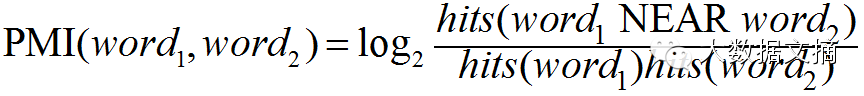 常用的计算PMI(word1, word2)方法是分别以”word1”,”word2”和”word1 NEAR word2”为query,根据搜索引擎检索结果,得到P(word)和P(word1, word2),如下:
