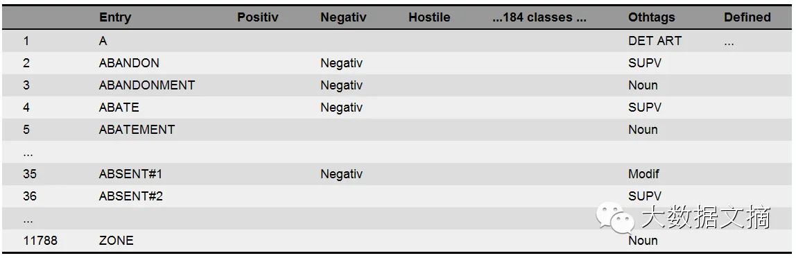 GI(The General Inquirer):该词典给出了每个词条非常全面的信息,如词性,反义词,褒贬,等,组织结构如下: