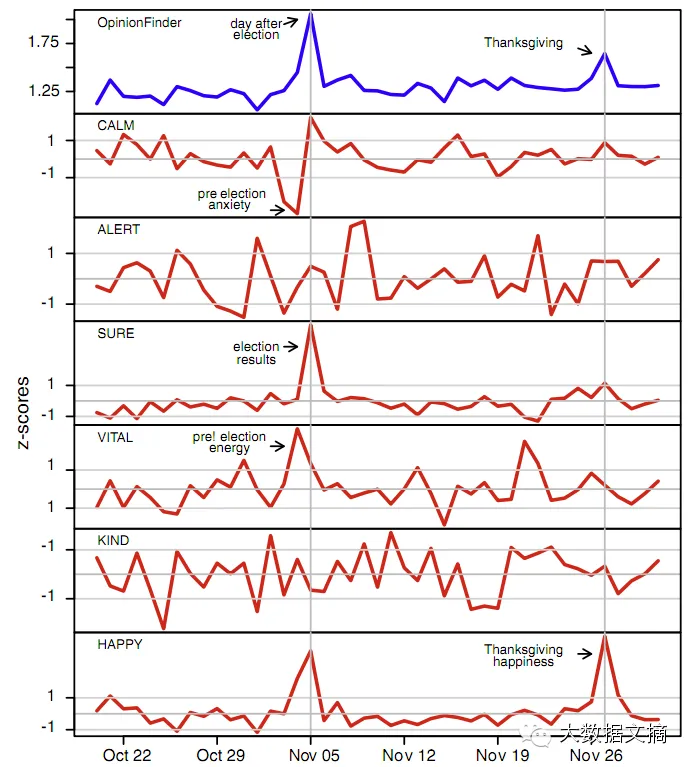 l Twitter sentiment: 通过Twitter用户情感预测股票走势,2012年5月,世界首家基于社交媒体的对冲基金 Derwent Capital Markets 在屡次跳票后终于上线。它会即时关注Twitter 中的公众情绪指导投资。正如基金创始人保罗•郝汀(Paul Hawtin)表示:“长期以来,投资者已经广泛地认可金融市场由恐惧和贪婪驱使,但我们从未拥有一种技术或数据来量化人们的情感。”一直为金融市场非理性举动所困惑的投资者,终于有了一扇可以了解心灵世界的窗户——那便是 Twitter 每天浩如烟海的推文,在一份八月份的报道中显示,利用 Twitter 的对冲基金 Derwent Capital Markets 在首月的交易中已经盈利,它以1.85%的收益率,让平均数只有0.76%的其他对冲基金相形见绌。类似的工作还有预测电影票房、选举结果等,均是将公众情绪与社会事件对比,发现一致性,并用于预测,如将“冷静CLAM”情绪指数后移3天后和道琼斯工业平均指数DIJA惊人一致。详细见论文: Johan Bollen, Huina Mao, Xiaojun Zeng. 2011. Twitter mood predicts the stock market, Journal of Computational Science 2:1, 1-8.(注:DIJA,全称Dow Jones Industrial Average)