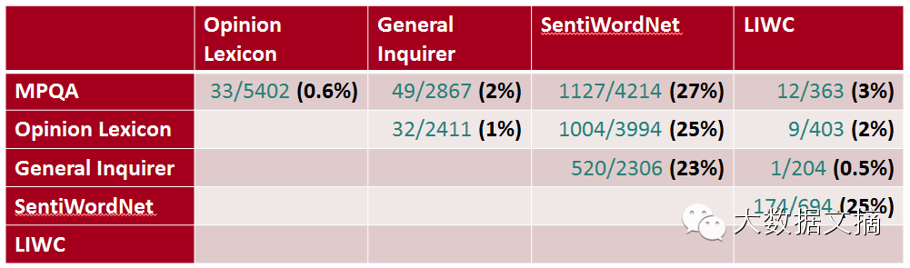 以上给出了一系列可用的情感词典资源,但是,如何选择一个合适的为我所用呢?这里,通过对比同一词条在不同词典之间的分类,衡量词典资源的不一致程度,如下: