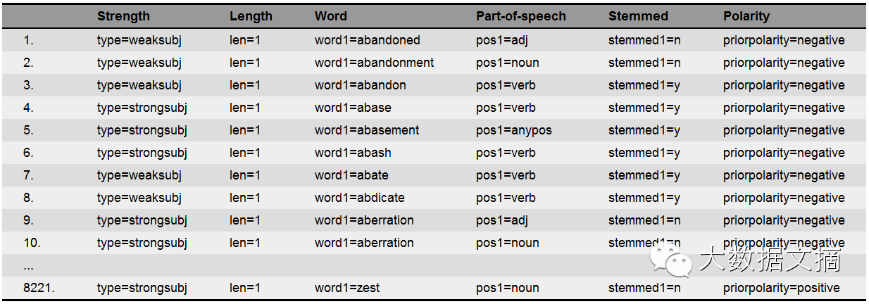 MPQA Subjectivity Cues Lexicon:其中包含Positive words: 2718,Negative words: 4912,组织结构如下图所示: