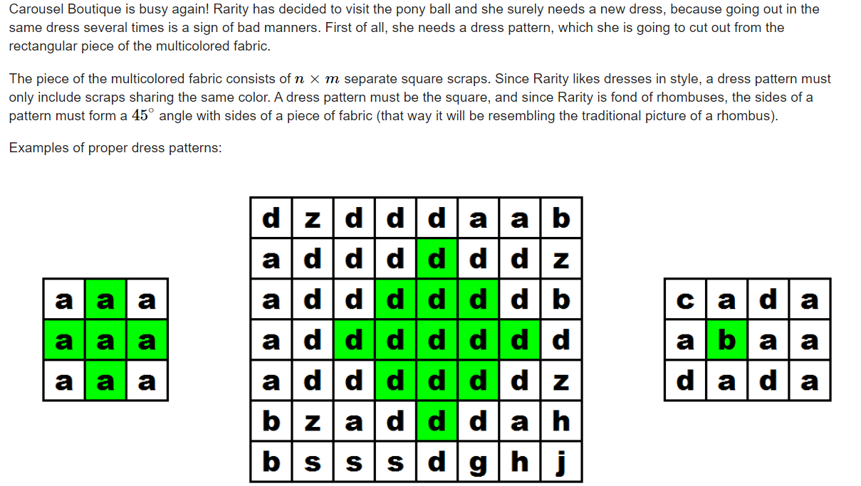 题目大概是从 n*m 的图中,找出菱形,菱形的形状由相同字母组成的题目中 涂绿 的形状