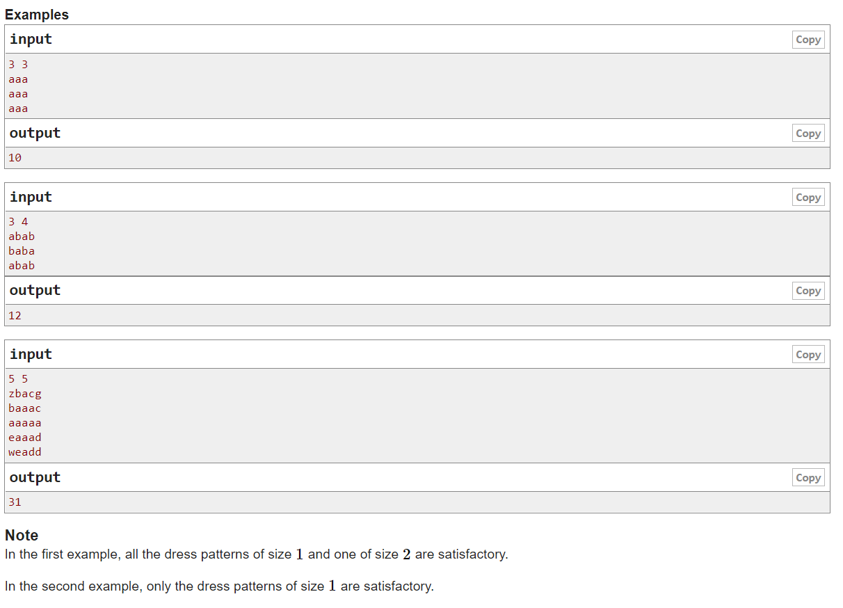{//IOS;while(~sdd(n,m)){ll ans=0;for(i=1;i<=n;i++){ss(ch[i]+1); }for(i=1;i<=n;i++){for(j=1;j<=m;j++){if(i==1) u[i][j]=0,dp[i][j]=1;if(i==n) d[i][j]=0,dp[i][j]=1;if(j==1) l[i][j]=0,dp[i][j]=1;if(j==m) r[i][j]=0,dp[i][j]=1;if(dp[i][j]){ continue; } if(ch[i][j]==ch[i][j-1]) l[i][j]=l[i][j-1]+1;else l[i][j]=0;}for(j=m;j>=1;j--){if(ch[i][j]==ch[i][j+1]) r[i][j]=r[i][j+1]+1;else r[i][j]=0;}}for(j=1;j<=m;j++){for(i=1;i<=n;i++){if(ch[i][j]==ch[i-1][j]) u[i][j]=min(u[i-1][j]+1,min(l[i][j],r[i][j]));else u[i][j]=0;}for(i=n;i>=1;i--){if(ch[i][j]==ch[i+1][j]) d[i][j]=min(d[i+1][j]+1,min(l[i][j],r[i][j]));else d[i][j]=0;dp[i][j]=min(d[i][j],u[i][j])+1 ;ans+=1ll*dp[i][j];}}pll(ans);}//PAUSE;return 0;