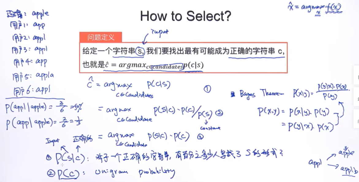 如果要计算P(C|S),也就是给定用户输入的词,正确的词的概率,那么根据贝叶斯定理,计算P(S|C) * P(C)即可,其中S是用户输入的词,C是正确的词。