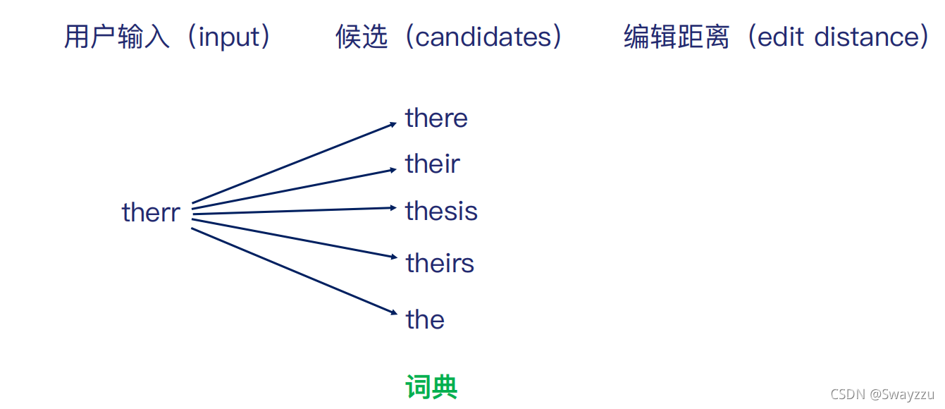 通过多少个操作才可以把写错的单词,转换成可能正确的单词。通常有3种方式:修改,添加,删除。每使用一次,则编辑距离+1。比如对于下面的therr,想变成their,则可以通过一次修改,把r修改为i,则编辑距离为1。