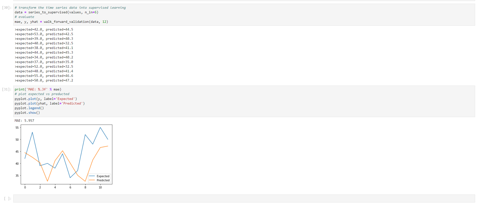 def walk_forward_validation(data, n_test):predictions = list()# split datasettrain, test = train_test_split(data, n_test)# seed history with training datasethistory = [x for x in train]# step over each time-step in the test setfor i in range(len(test)):# split test row into input and output columnstestX, testy = test[i, :-1], test[i, -1]# fit model on history and make a predictionyhat = xgboost_forecast(history, testX)# store forecast in list of predictionspredictions.append(yhat)# add actual observation to history for the next loophistory.append(test[i])# summarize progressprint('>expected=%.1f, predicted=%.1f' % (testy, yhat))# estimate prediction errorerror = mean_absolute_error(test[:, -1], predictions)return error, test[:, -1], predictions# %%# transform the time series data into supervised learning
