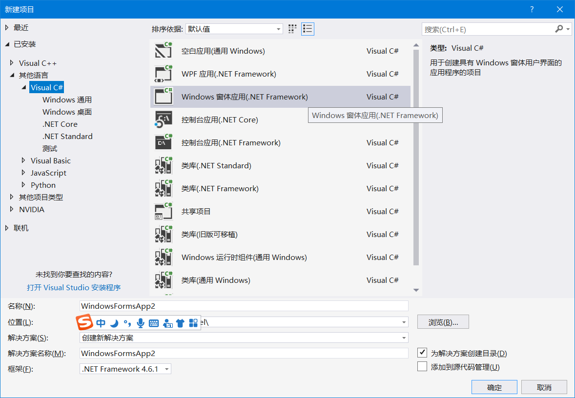 2.文件-新建项目-模板-Visual C#-Windows-Windows窗体应用程序