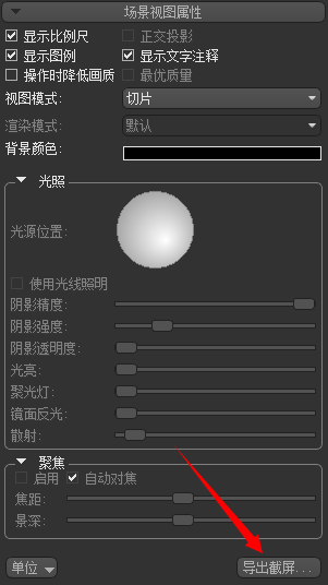 展开左侧工具栏场景视图属性,右下角有导出截屏,选择需要截屏的视图,点击导出截屏后弹出截屏尺寸的窗口,设置好图像的尺寸(分辨率)后确定,保存截屏。