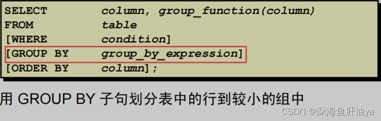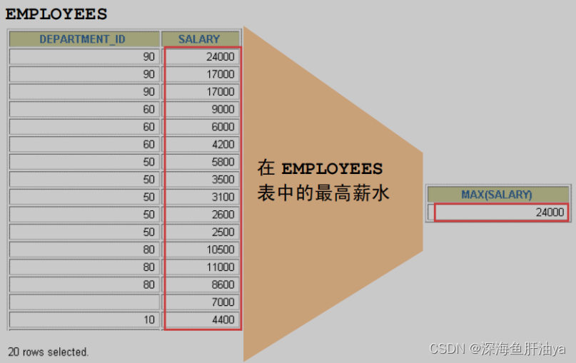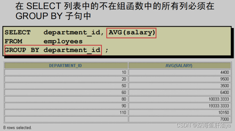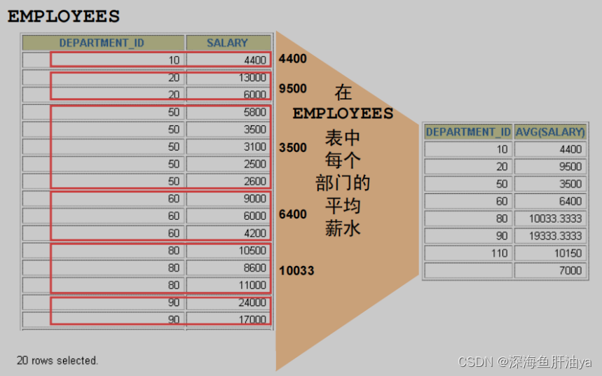 - GROUP BY 子句指定行怎样被分组。行用部门号分组,所以 AVG 函数被应用于薪水列,以计算每个部门的平均薪水。