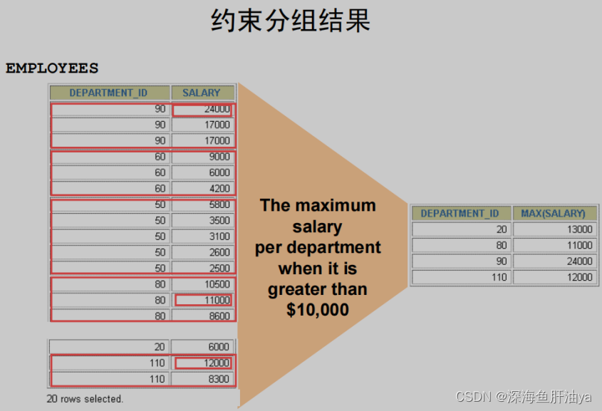 用 WHERE 子句约束选择的行,用 HAVING 子句约束组。 为了找到每个部门中的最高薪水,而且只显示最高薪水大于 $10,000 的那些 部门,可以象下面这样做: