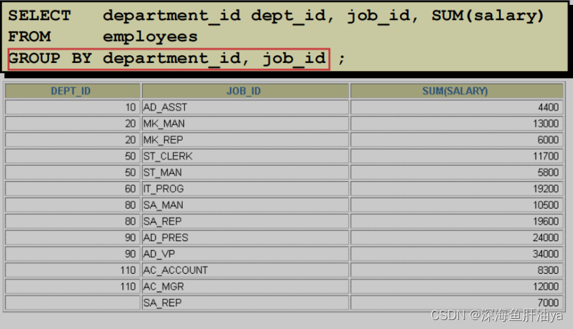 如此 SUM 函数被用于每个部门号分组中的所有 job ID 的 salary列。