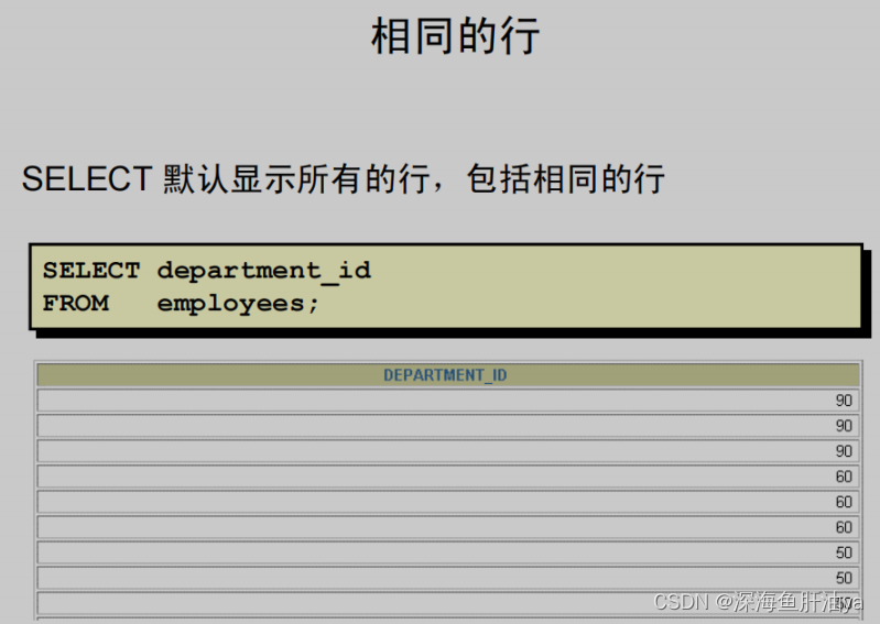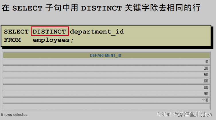 注意 distinct 关键字是使一条数据不重复,比如 select distinct department_id,salary from employees;