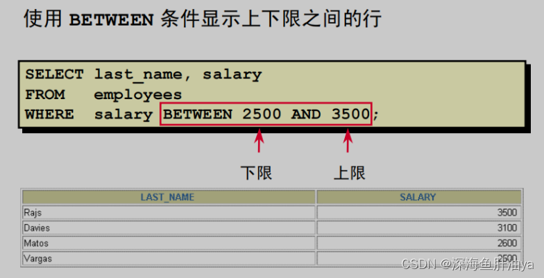 可以用 BETWEEN 范围条件显示基于一个值范围的行。指定的范围包含一个下限和一个上限。