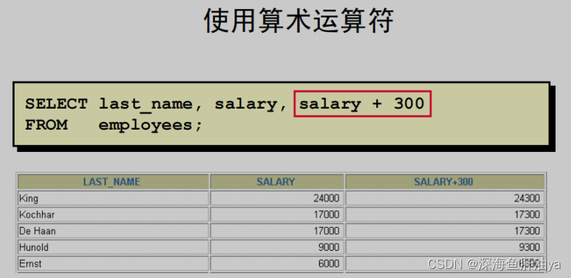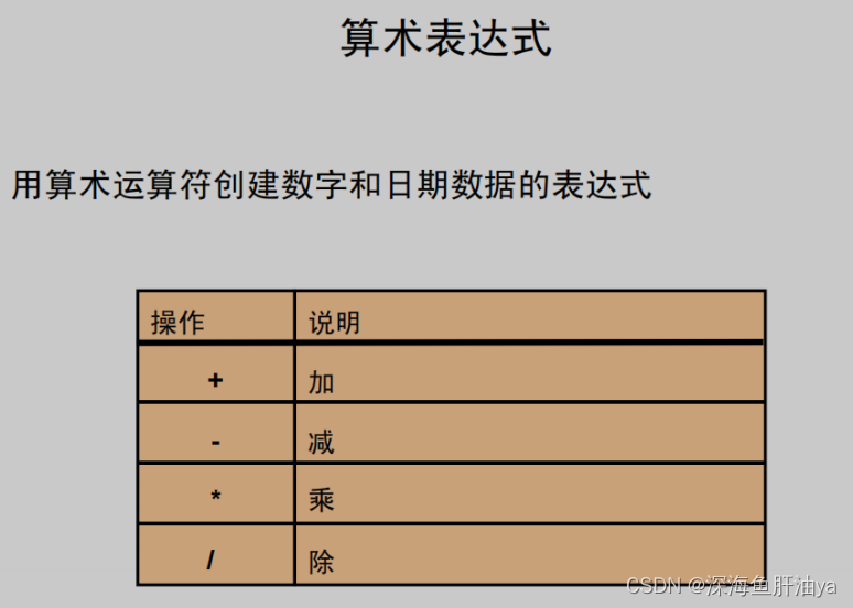 需要修改数据显示方式,如执行计算,或者作假定推测,这些都可能用到算 术表达式。一个算术表达式可以包含列名、固定的数字值和算术运 算符。