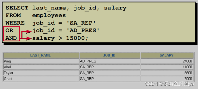 第一个条件是 job_id 是 AD_PRES 并且薪水高于 15,000 。