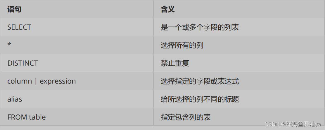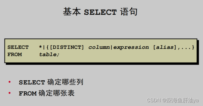 列选择: 能够使用 SELECT 语句的列选择功能选择表中的列,这些列是想 要用查询返回的。当查询时,能够返回列中的数据。