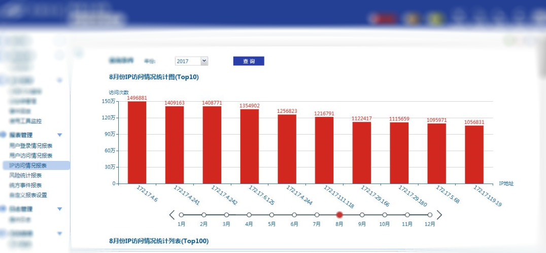统方报表日历可以直观看到高危统方事件发生的日期,直接从日历进入统方事件查询列表,方便、简单、快捷。并且通过报表能够查询具体时间内某个IP累计触发的告警次数。