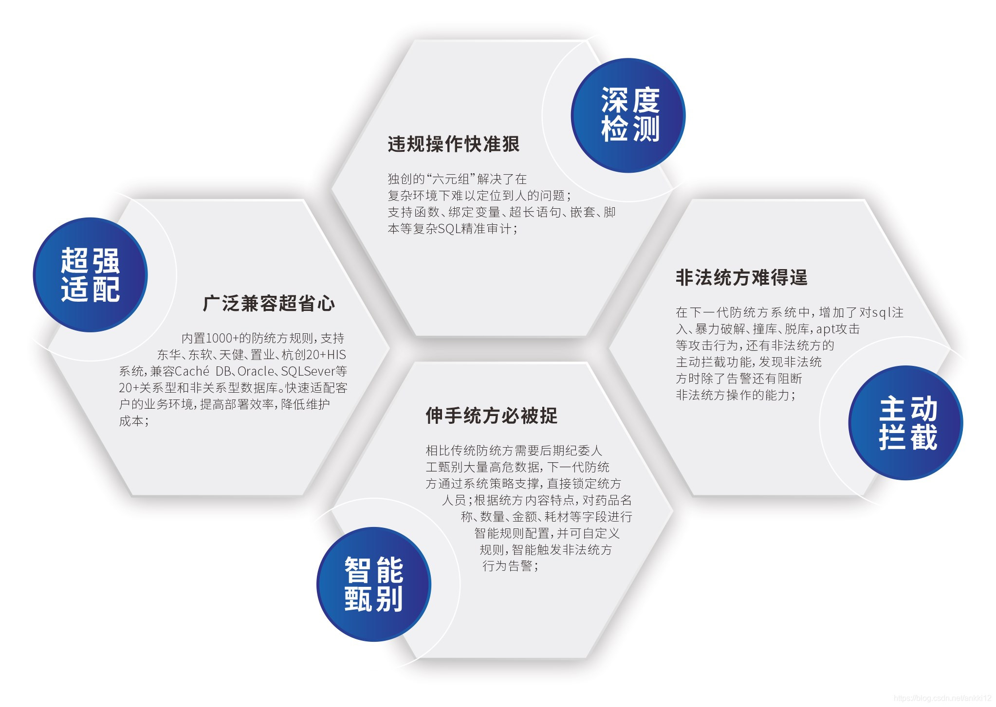作为国内领先的数据安全解决方案提供商,昂楷下一代防统方系统采用了先进的信息安全防范技术,可事前主动防御、事中实时报警,安全阻断、事后定位取证,全方位对统方行为进行严密监控,满足卫计委防统方的政策需求。