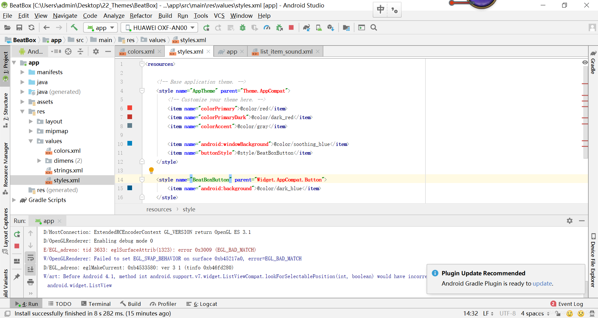 <resources> <style name="AppTheme" parent="Theme.AppCompat.Light.DarkActionBar"> <item name="colorPrimary">@color/colorPrimary</item> <item name="colorPrimaryDark">@color/colorPrimaryDark</item> <item name="colorAccent">@color/colorAccent</item> </style> <style name="BeatBoxButton"> <item name="android:background">@color/dark_blue</item> </style>