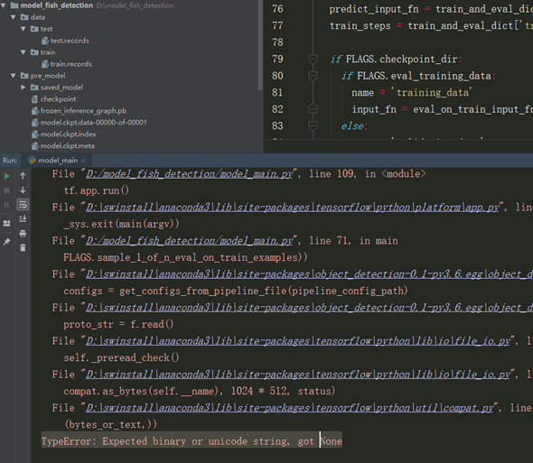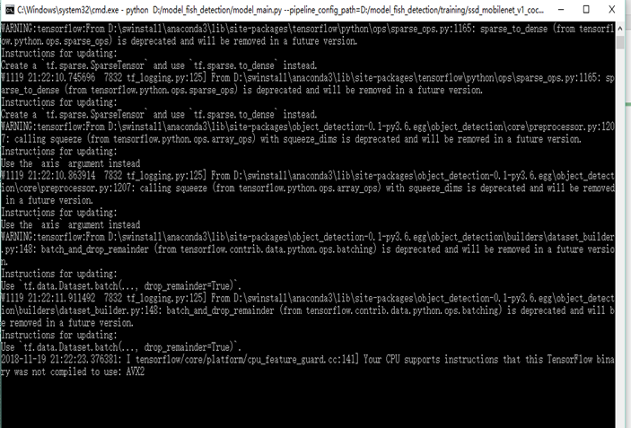 Python D:/model_fish_detection/model_main.py --pipeline_config_path=D:/model_fish_detection/training/ssd_mobilenet_v1_coco.config --model_dir=D:/model_fish_detection/result --num_train_steps=500 --num_eval_steps=200 --alsologtostderr