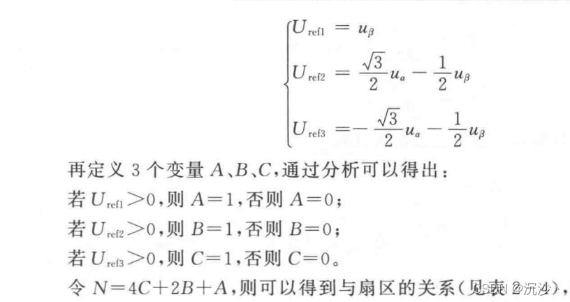 空间电压矢量的扇区仅有6个,那么出现端口值为7的现象,可推测是N的计算过程出现问题,书中对于扇区号N的计算如下图所示: