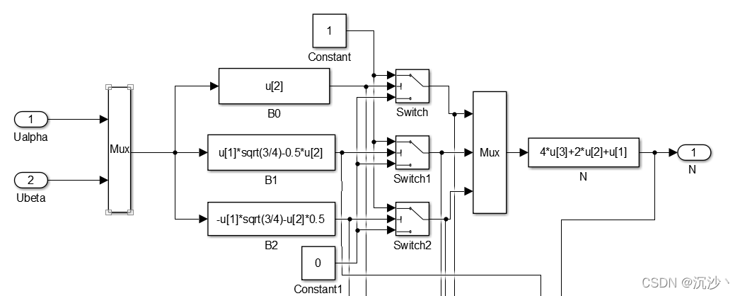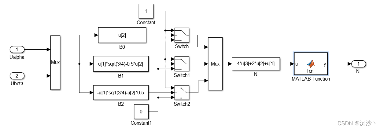 通过Ualpha和Ubeta计算出三个变量A、B、C的值,并通过 N = 4C + 2B + A 计算扇区号。当输入Ualpha和Ubeta全为0的时候,A = 0 、B = 1 、C = 1 ,因此 N = 4+2+1 = 7,从而超过扇区号的范围1-6,进而报错。仿真模型的搭建框图如下图所示,对其进行仿真后发现,确实会出现Ualpha = 0,Ubeta = 0时 N = 7的情况,由于Ualpha = 0,Ubeta = 0是变频器无任何输出的情况,从上图中空间电压矢量的分布图可看出,其实此时的电压空间矢量不属于任何扇区,他属于坐标系的原点(0,0)。因此这种特殊情况特殊处理即可,即加一个判断条件,当扇区号N = 7时,将其分配到N=1即可,因为没有电压矢量没有任何幅值,也不会对输出造成任何的影响。