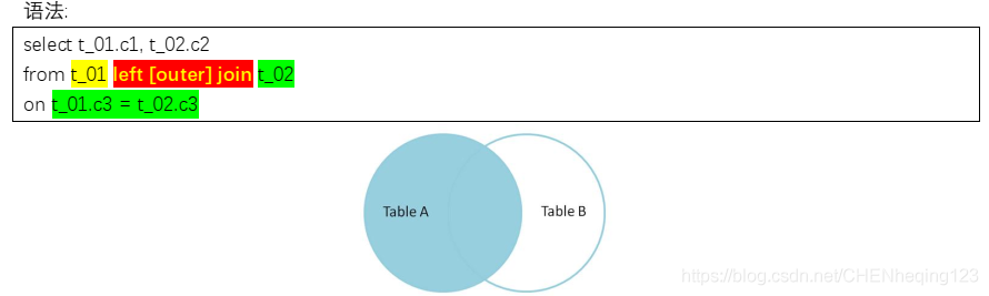 左连接: left [outer] join,左连接从左表(t_01)取出所有记录,与右表(t_02)匹配。如果没有匹配,以 null 值代表