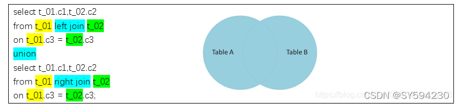 内连接,也叫等值连接, inner join 得出同时存在 t_01 和 t_02 的数据集,通俗一点说就是求两个表的