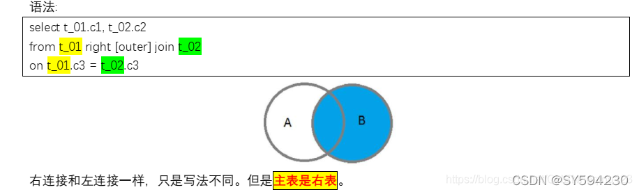 右连接: right [outer] join,右连接从右表(t_02)取出所有记录,与左表(t_01)匹配。如果没有匹配,以 null 值代表