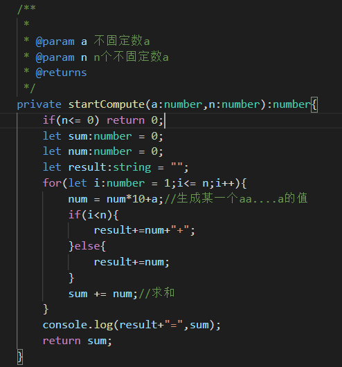 咋一看,不好下手,但是仔细一瞅,很有规律,不定数a的值跟n有关,关键是要构造一个不定数a的表达式,这个表达式一构建出来,求和自然就so easy!定义一个变量存储a,n没增加一个,a就增加10倍,按照这个规律,可以构建出生成a的表达式,假设用一个变量num ,存储n个a的值,num可以表示成:num = 10 * a+a(a=2,n = 2,num=22,a=2,n=3,num = 22 * 10 + 2 = 222);就这样,最终的和就出来了,代码如下: