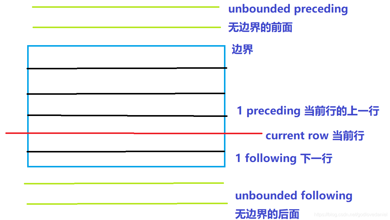 unbounded preceding即第一行是指表中的第一行, unbounded following即最后一行是指表中的最后一行。