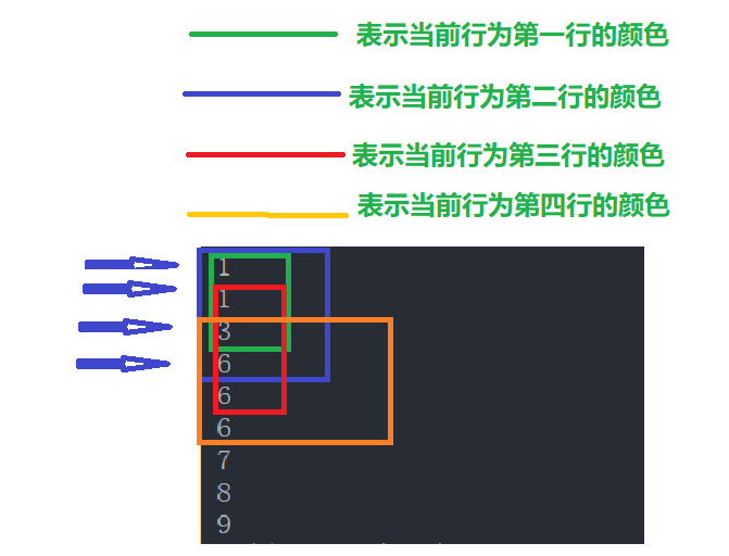 当为第四行时:id=6, 计算公式为id-1=<id<=id +2,范围为:[5,8]。即id值包含在5~8之间的所有行,id值大于5小于8的行。具体如下图所示