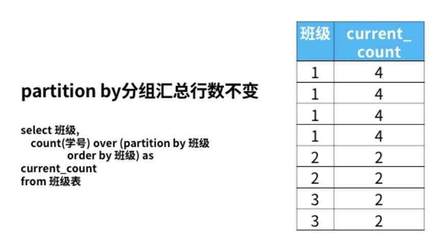 3.group by 汇总后行数减少,partition by汇总后原表中的行数没变。这个也是为什么使用窗口函数分组而不使用group by的原因。具体如下所示: