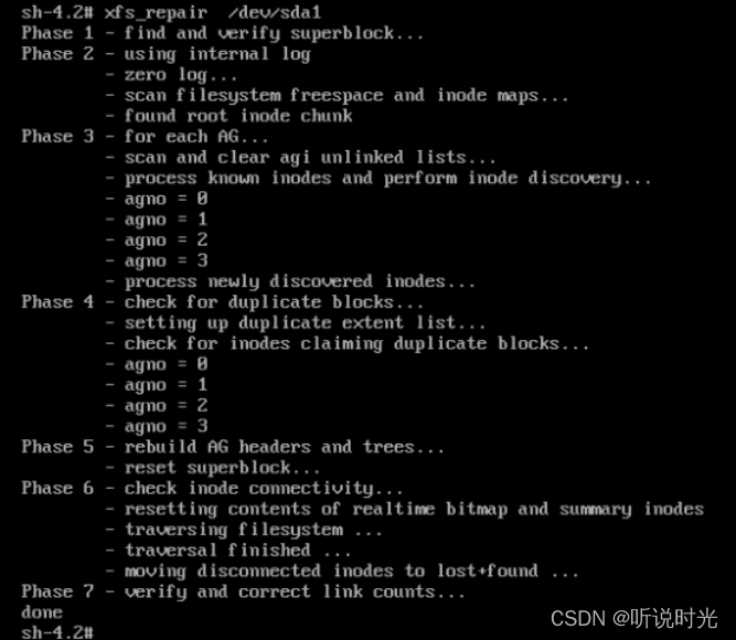 4)先执行xfs_repaire /dev/sda1等待,若失败则执行xfs_repaire -L /dev/sda1(清除日志修复,此操作有风险)。