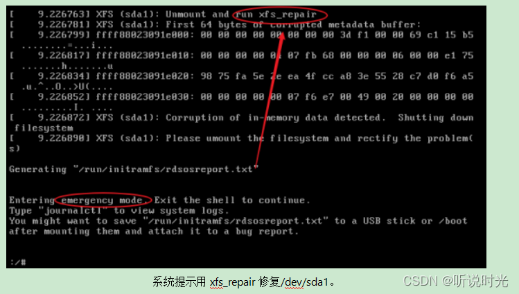 该图中,系统提示使用xfs_repair进行修复/dev/sda1