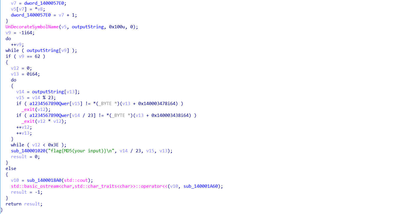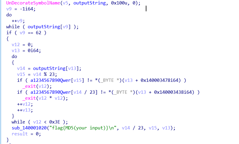 下面的操作,先是UnDecorateSymbolName函数,这个函数是反修饰指定已修饰的 C++ 符号名。随后利用62位的outputstring,进一步对比判断。
