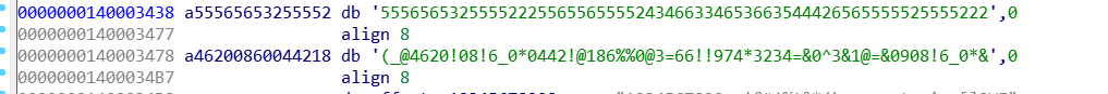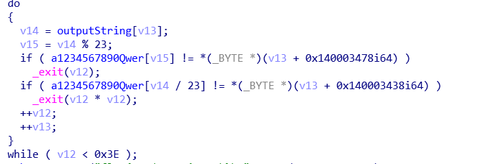 还是比较简单的,0x140003478和0x140003438处分别是两个字符串。总的来说就是用outputString中的值除以23,得到商和余数。将商和余数带入到 1234567890....这个大数组中,商和余数能满足 a1234567890Qwer[v14 / 23] 、a1234567890Qwer[v15]等于相应的 0x140003478和0x140003438 中的值。因此反推的字符=23*商+余数。