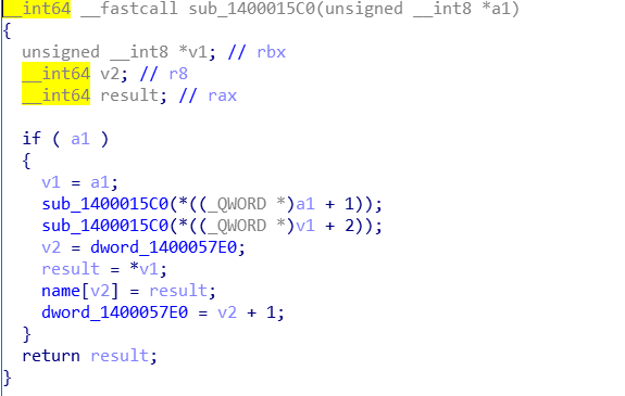 首先是第一部分,这一部分是先进行了输入,然后判断是否是31字节,将我们的输入使用sub_14001290()函数。这个函数,我一开始以为是一个加密函数,看起来挺复杂的。通过下面的sub_1400015C0()函数有一些提示。if(v4)下面的部分完全就是一个后序遍历嘛?所以说,这个函数可以猜测是构造二叉树的函数。 (下面第二张图是后序遍历的代码)。