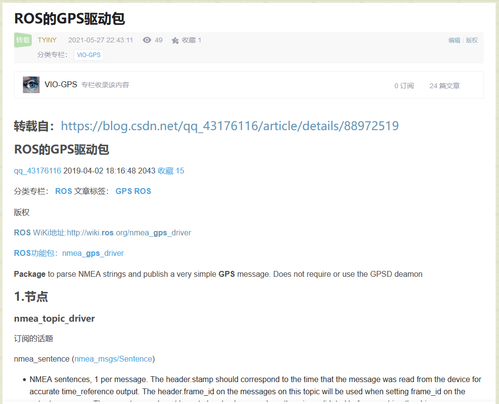 我在《ROS机器人编程实战》里面就看到专门一节说了GPS(NEMA协议的,用的ublox的GPS模块)接入ROS的功能包就是我用的这个,当然是NEMA协议的。