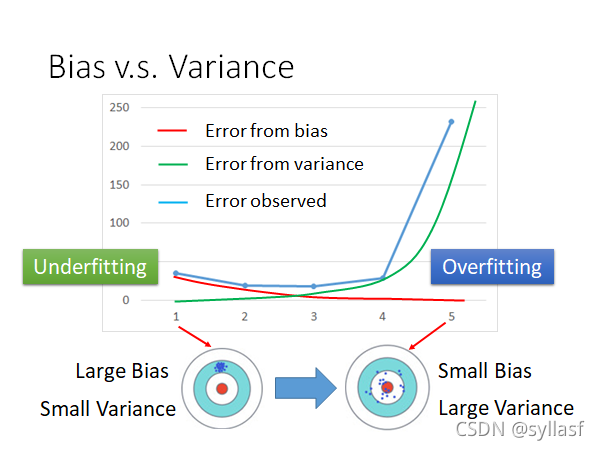准确辨别究竟是哪个大非常重要 如果是模型无法拟合 就是bias大 如果是可以拟合训练集拟合不了测试集 就是overfitting various大。